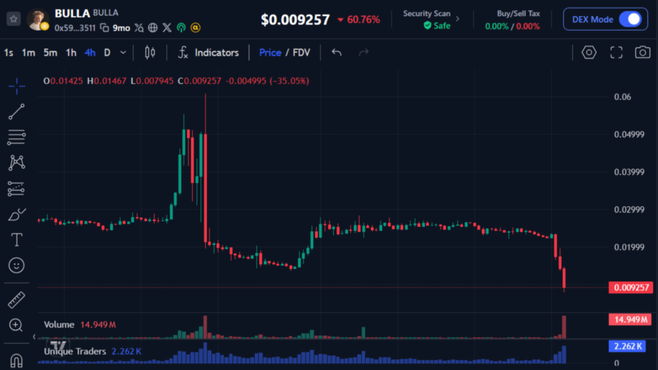 Il token BULLA ha subito un drammatico crollo del prezzo il 10 marzo 2026, dopo che un forte rally precedente si è trasformato in una pesante pressione di vendita. Il token è sceso a circa $0.0092 dopo aver aperto vicino a $0.014 e aver raggiunto un massimo di sessione vicino a $0.0146. Una massiccia candela rossa sul grafico riflette il repentino cambiamento nel sentimento, con il prezzo che è sceso bruscamente dai livelli più alti precedentemente visti vicino alla fascia di $0.02. Questo tipo di rapido aumento seguito da un forte calo è comune nel settore delle meme coin, dove gli acquisti guidati dall'hype possono rapidamente trasformarsi in vendite in panico.