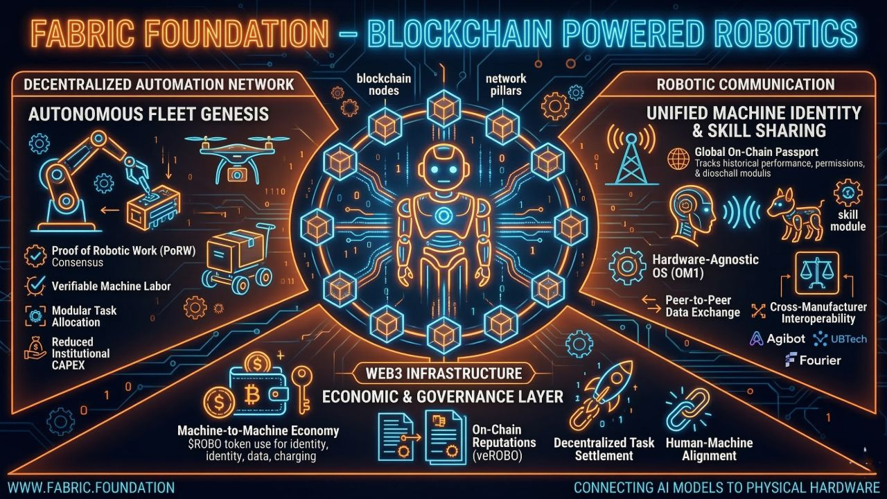 The Fabric Foundation focuses on building decentralized infrastructure that allows robotic systems and automated machines to communicate securely using blockchain technology.