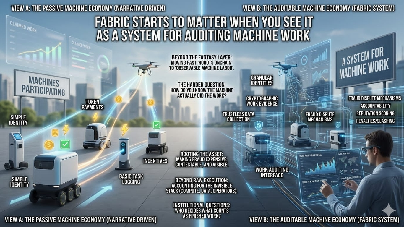 Not in a whitepaper diagram. Not in a staged demo. Not in the polished environment where every moving part has been arranged to make the system look inevitable. I mean in the real world, where work is partial, outcomes are messy, evidence is weak, and bad performance can still be made to look respectable once it is translated into a dashboard. That is where most of these ideas start losing their confidence. And that is where Fabric becomes more interesting than the usual market story around machines, automation, and tokenized participation.