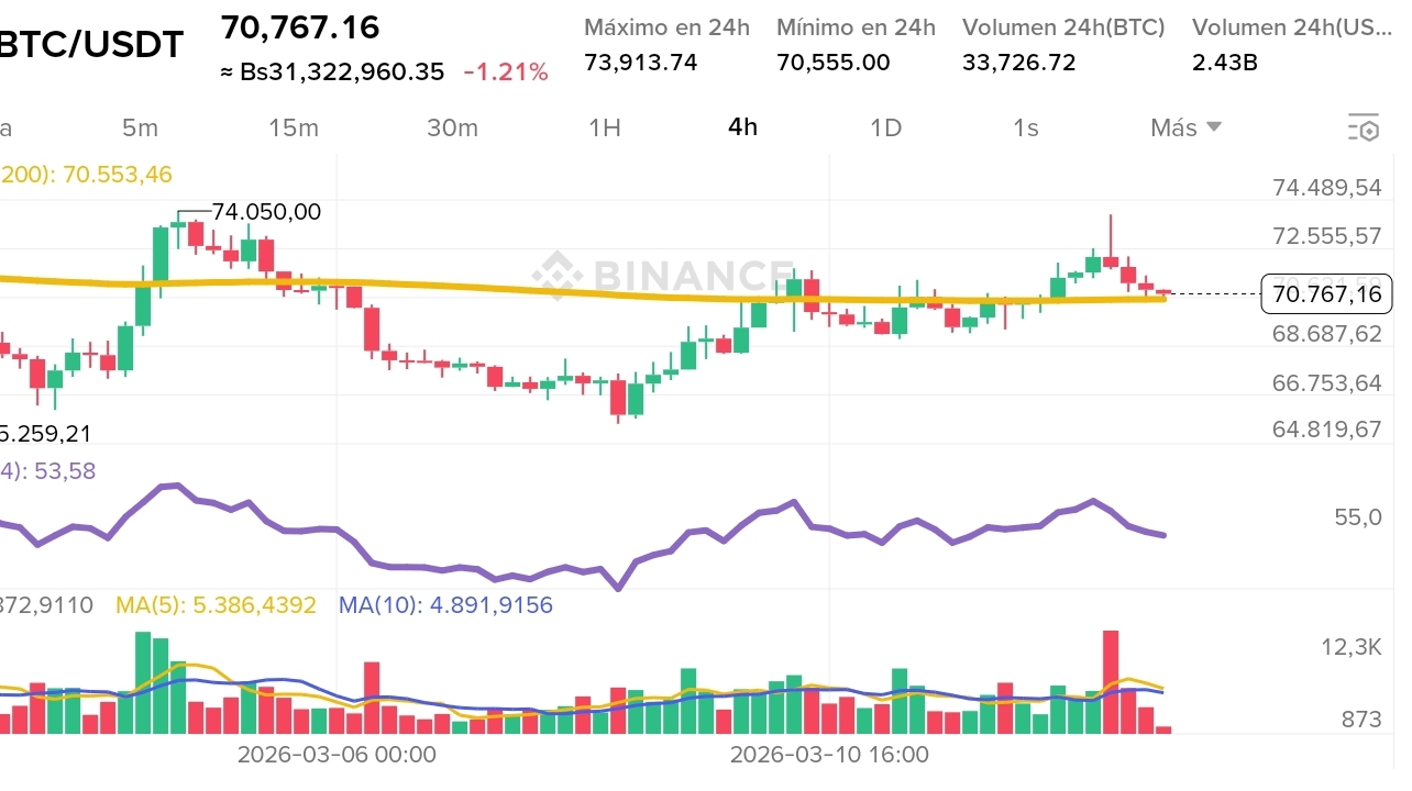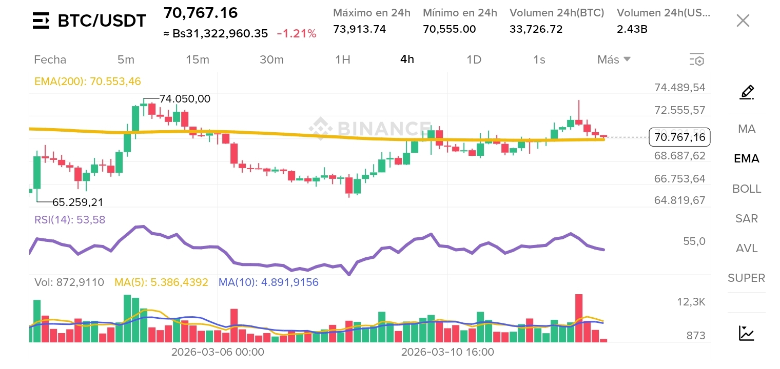Supporto chiave nella EMA 200: Attualmente, il prezzo sta "lottando" appena sopra la EMA 200 (intorno ai $70,553). È una zona vitale; finché rimaniamo al di sopra di essa, la struttura continua a darci un po' di fiducia.