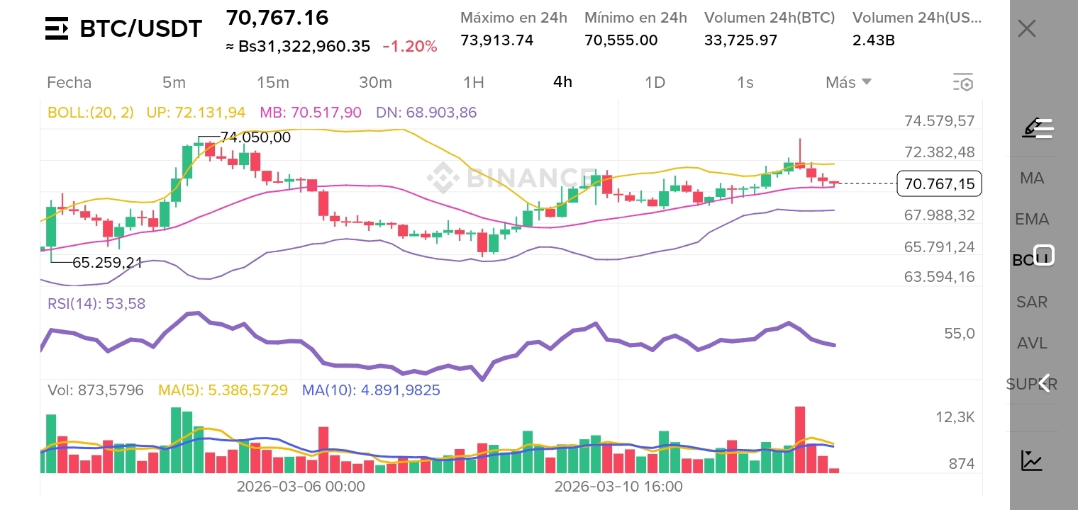 Bande di Bollinger: Stiamo vedendo che il prezzo sta cercando supporto nella banda media (MB: $70,517). C'è una leggera compressione, che solitamente precede un movimento con intenzione.