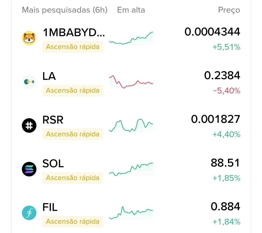 - 1MBABYDOGE: +5,51% (0.0004344) — Volume e buscas explodindo.