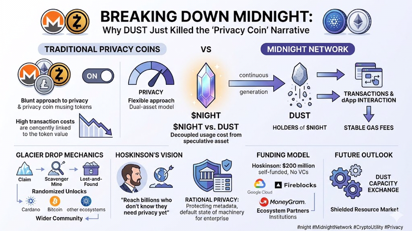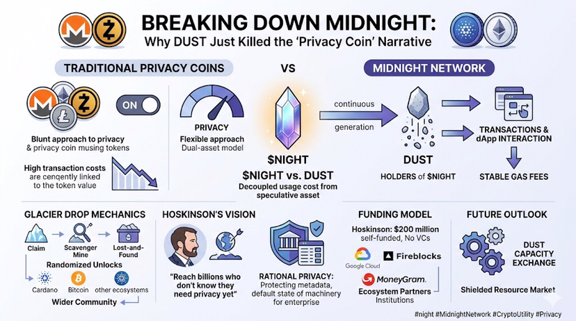 Ho anche letto la trascrizione del discorso di Hoskinson al Consensus di Hong Kong. Ha detto qualcosa che ha riformulato l'intero progetto per me: Midnight non sta cercando le persone che sanno già di aver bisogno di privacy. Sta cercando i miliardi che non sanno ancora di averne bisogno. Questo è un cambiamento massiccio nella strategia. La privacy non dovrebbe essere qualcosa a cui ci si può iscrivere quando si sta facendo qualcosa di sensibile. Dovrebbe essere lo stato predefinito della macchina, in modo che i tuoi metadati—chi paghi, quando li paghi, quanto—non siano in giro per essere estratti dai dati.
