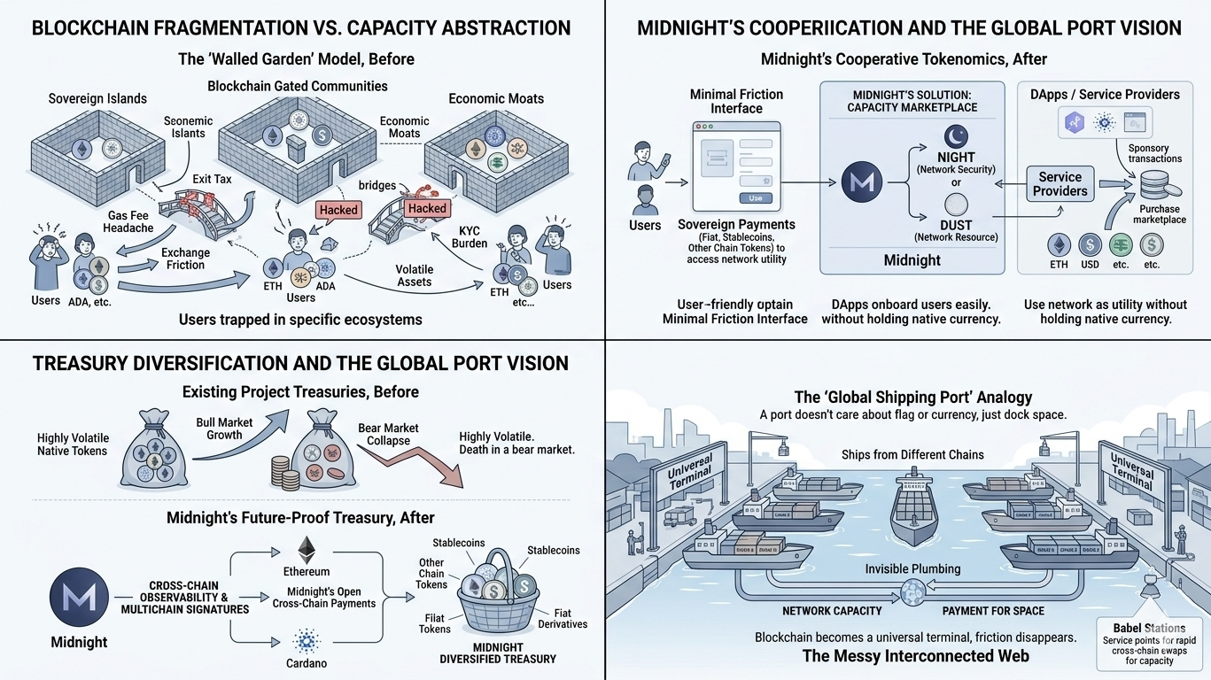 Abbiamo passato anni a trattare le blockchain come isole sovrane dove l'unico modo per commerciare è imparare una nuova lingua e coniare una nuova valuta. Ma se mai ci muoveremo oltre la fase speculativa di questa industria, dobbiamo smettere di costruire fortezze digitali e iniziare a costruire qualcosa di più simile a un porto marittimo globale. Un porto non si preoccupa di quale bandiera sia sulla tua nave o quale valuta hai in tasca fintanto che puoi pagare per lo spazio del molo. Midnight sta cercando di costruire quel porto, trasformando la blockchain da un giardino recintato in un terminal universale dove l'attrito della tecnologia finalmente scompare sullo sfondo.