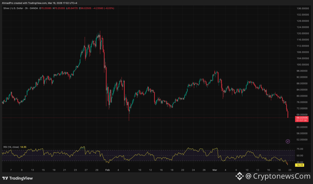 After surging to near $90, the metal collapsed 27% in just over a week. Bottom landed somewhere in the $64 to $74 range. The chart looks like a crime scene.