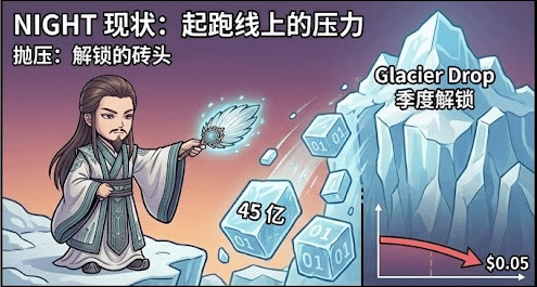 尤其是,NGIHT现在正好遇到了核心阻力:“Glacier Drop”的季度解锁。有大概45亿枚的代币在陆续解锁,不然的话,凭借3月份的主网发布利好,代币是有机会冲一波的。
