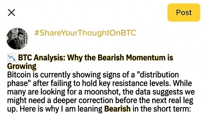 #ShareYourThoughtOnBTC Bitcoin mostra attualmente segni di una "fase di distribuzione" dopo aver fallito nel mantenere i livelli di resistenza chiave. Mentre molti cercano un colpo di fortuna, i dati suggeriscono che potremmo aver bisogno di una correzione più profonda prima del prossimo vero rialzo. Ecco perché mi sento ribassista nel breve termine: