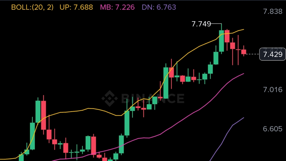 L'RSI Stocastico giornaliero è fissato a 100 con il prezzo esteso ben sopra la banda superiore di Bollinger a 7.3592, che è un segnale di esaurimento da manuale dopo una corsa quasi verticale. Il 4H è anch'esso ipercomprato a 92-97 sull'RSI Stocastico con il prezzo che tocca la banda superiore a 7.4839 e inizia a rifiutare. Sull'1H, il SAR ha già girato ribassista a 7.7172 e l'RSI Stocastico è sceso a 5.47, confermando che la pressione di vendita a breve termine si sta accumulando dal massimo swing di 7.7260. Una chiusura 1H sotto 7.4389 EMA7 conferma il trigger ribassista. Il principale rischio è un picco guidato da notizie che riconquista 7.7260, il che invaliderebbe completamente l'impostazione.