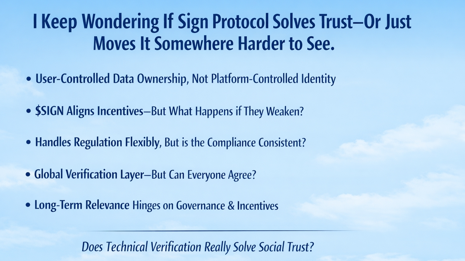 L'idea di Sign come "strato di verifica globale" è interessante, forse anche necessaria. In questo momento, la verifica è frammentata: ogni sistema ricontrolla ciò che un altro sistema ha già verificato. Sign cerca di rimuovere quella ridondanza. Ma la tensione qui è sociale, non tecnica. Affinché questo funzioni, più parti devono concordare su standard condivisi di fiducia, e storicamente... è lento e disordinato.