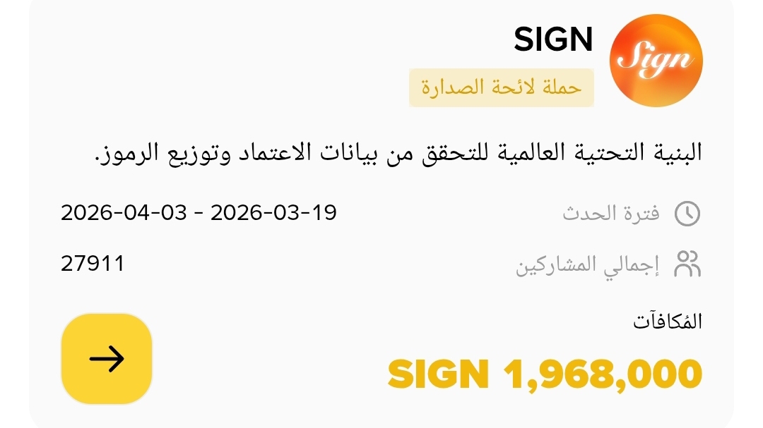 تابع وانشر وتداول لتربح 984,000 SIGN من مُكافآت لائحة الصدارة العالمية. للتأهل للوصول إلى لائحة الصدارة والحصول على المكافأة، يجب أن تُكمل كل نوع من المهام (النشر: اختر 1) مرّة واحدة على الأقل خلال الفعالية. ستُعدّ المنشورات التي تتضمن ظروفًا حمراء أو هدايا غير مؤهلة. سنستبعد من الفعالية أي مشارك يتبين أنّه يمارس مشاهدات أو تفاعلات مشبوهة، أو يُشتبه في استخدامه بوتات آلية. سيؤدي أي تعديل على منشورات نُشرت سابقًا وحققت تفاعلًا مرتفعًا بهدف إعادة توظيفها كعمليات تقديم للمشروع إلى الاستبعاد. تعرض لائحة صدارة المشروع البيانات بتأخير T+2. على سبيل المثال، ستظهر بيانات 02-04-2026 على صفحة لائحة الصدارة بعد 04-04-2026 الساعة 09:00 (UTC). سيتم توزيع مكافآت القسائم قبل 22-04-2026. للمزيد من التفاصيل، يُرجى العتابع وانشر وتداول لتربح 984,000 SIGN من مُكافآت لائحة الصدارة العالمية. للتأهل للوصول إلى لائحة الصدارة والحصول على المكافأة، يجب أن تُكمل كل نوع من المهام (النشر: اختر 1) مرّة واحدة على الأقل خلال الفعالية. ستُعدّ المنشورات التي تتضمن ظروفًا حمراء أو هدايا غير مؤهلة. سنستبعد من الفعالية أي مشارك يتبين أنّه يمارس مشاهدات أو تفاعلات مشبوهة، أو يُشتبه في استخدامه بوتات آلية. سيؤدي أي تعديل على منشورات نُشرت سابقًا وحققت تفاعلًا مرتفعًا بهدف إعادة توظيفها كعمليات تقديم للمشروع إلى الاستبعاد. تعرض لائحة صدارة المشروع البيانات بتأخير T+2. على سبيل المثال، ستظهر بيانات 02-04-2026 على صفحة لائحة الصدارة بعد 04-04-2026 الساعة 09:00 (UTC). سيتم توزيع مكافآت القسائم قبل 22-04-2026. للمزيد من التفاصيل، يُرجى الع#SignOfficial