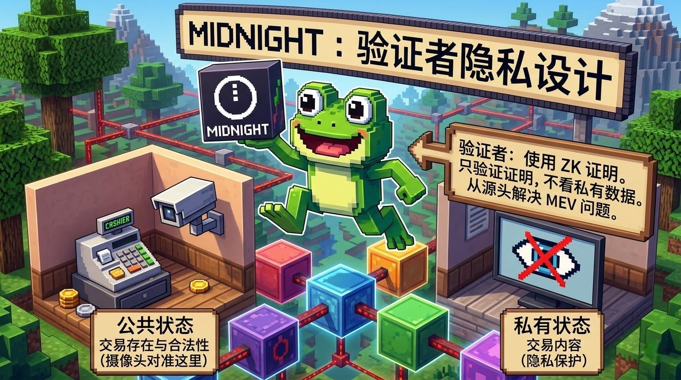 Midnight的设计把这两件事拆开了。验证者,也就是$NIGHT 里的block producer,负责打包交易和维护公共状态,但私有状态的内容对它们是不可见的,它们只能看到ZK证明是否成立,看不到证明背后的私有数据是什么。就像我邻居把摄像头对着收银机,员工的操作结果是可见的,但操作过程里的细节不在镜头里。这个设计从根本上切断了验证者利用私有数据做MEV的可能,因为它们根本看不到可以利用的信息。