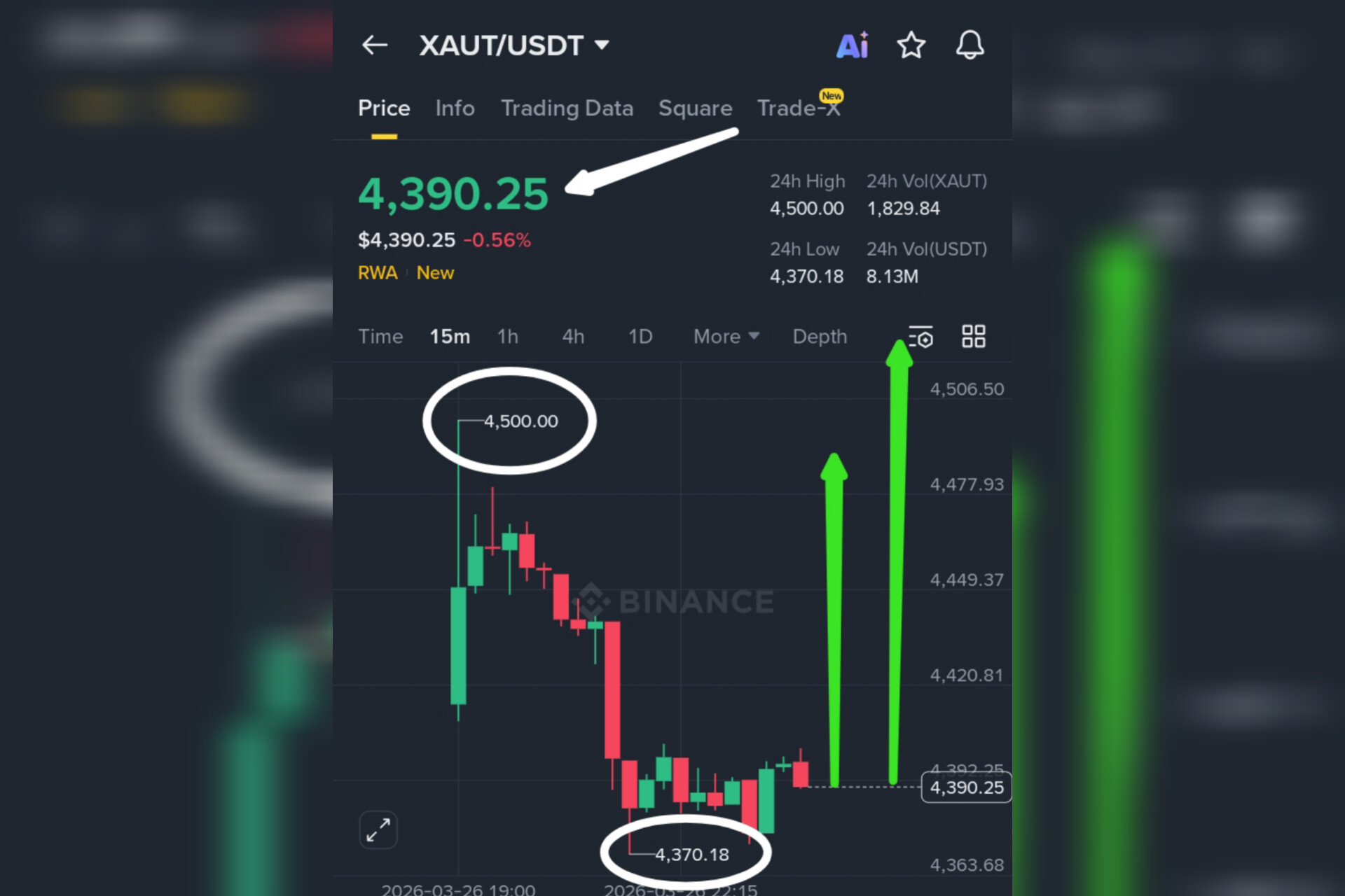 $XAUT just listed on Binance on March 26 at 21:30 UTC+8, now trading at $4,390.25 with a slight -0.56% pullback after touching $4,500. The real story is beneath the surface – perpetual futures volume exploded to $6.40 billion on March 23, making XAUT the #5 most traded perp pair on Binance . That's a 4,000x increase from December 2025. Smart money already positioned. The crowd is just waking up. 🎯