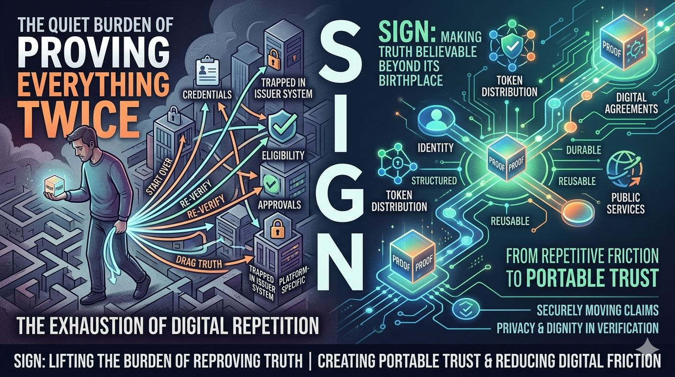 I still think one of the most exhausting parts of the digital world is how often a person has to start over. You verify yourself once, then again somewhere else, then again in a slightly different format for a system that refuses to recognize what was already proven. After a while it stops feeling like technology is helping. It starts feeling like you are dragging the same truth from door to door, hoping each new system will accept it. That is the space where SIGN begins to feel meaningful to me. Not as a flashy crypto idea, and not as another polished promise about the future, but as a response to something quietly frustrating that people deal with all the time. A person can be eligible, approved, authorized, registered, verified, or entitled to receive something, yet the proof of that fact often remains trapped in the place where it was first issued. The truth exists, but it does not travel well.