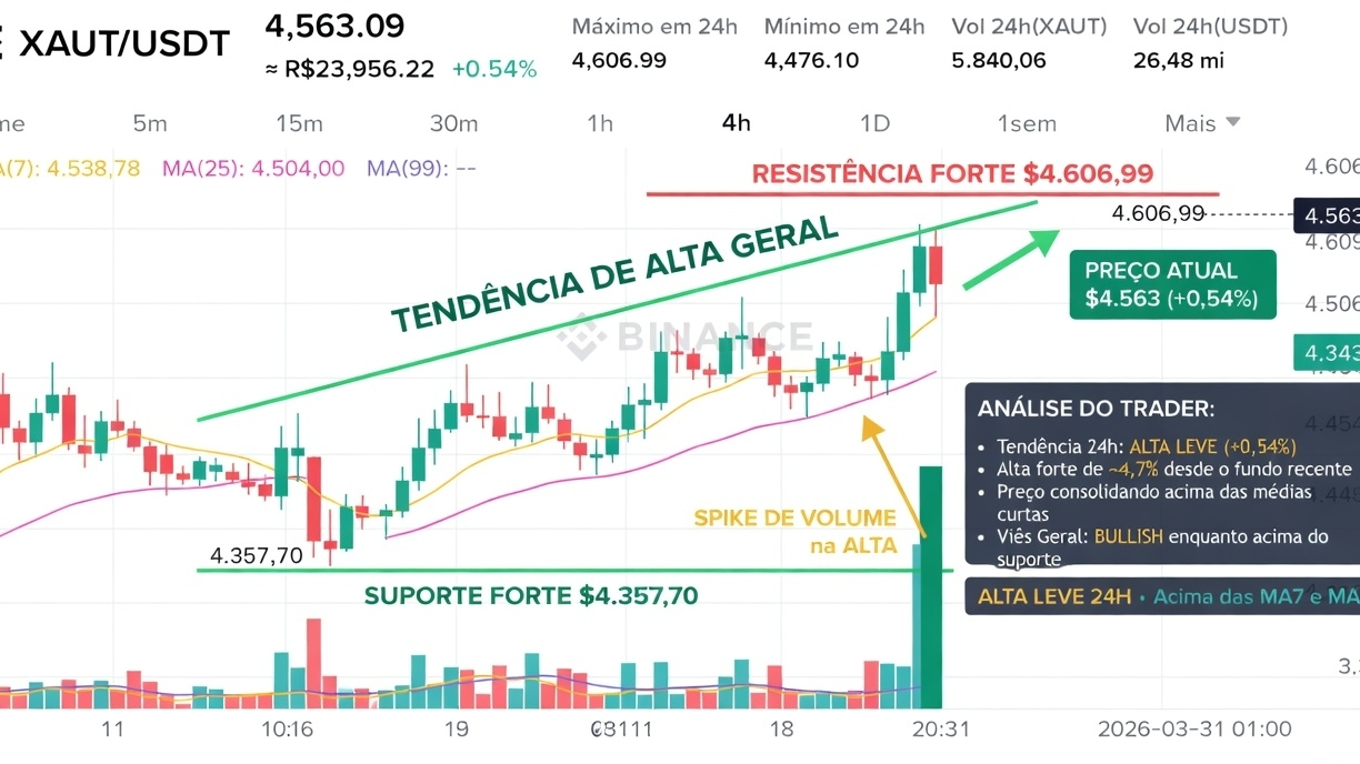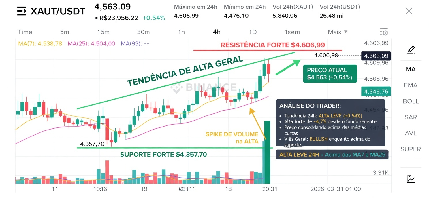 Depois de tocar o fundo em 4.357,70, o preço subiu forte e agora está em 4.563,09 (+0,54% nas últimas 24h), consolidando acima das médias curtas (MA7 e MA25) e testando a região dos 4.606,99.