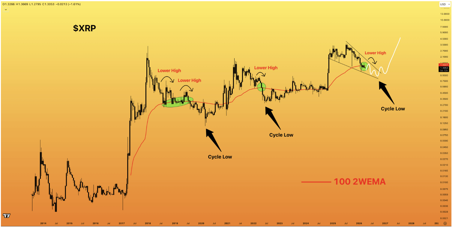 La EMA a 200 settimane rimane il livello definitorio nell'attuale struttura. Finché XRP scambia al di sotto di essa, il mercato continua a riflettere la debolezza di fine ciclo piuttosto che un'inversione confermata. Il grafico suggerisce che la struttura a lungo termine si è indebolita, i massimi decrescenti rimangono intatti e un ultimo movimento verso il basso è ancora possibile.