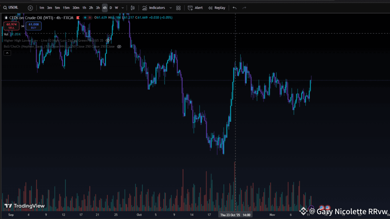 Dopo aver formato un doppio minimo vicino a $57.00, il prezzo ha superato i massimi di liquidità a breve termine (~$60.70), spostando la struttura di mercato 4H verso rialzista.