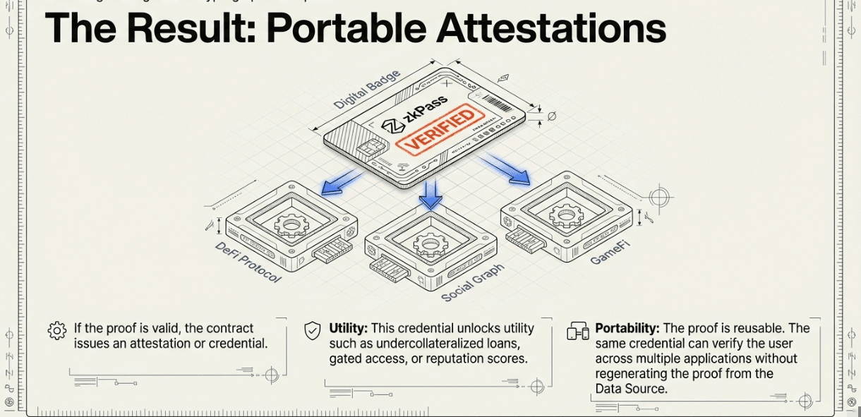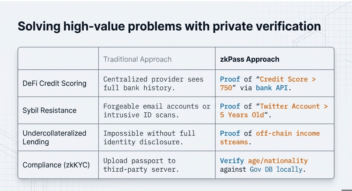 L'architettura elimina tre ostacoli critici. In primo luogo, non è necessaria l'integrazione della DataSource, se parla HTTPS, funziona con zkPass. In secondo luogo, la privacy è garantita crittograficamente piuttosto che basata su politiche, i verificatori matematicamente non possono accedere ai dati grezzi. In terzo luogo, le prove sono portatili e riutilizzabili, generate una volta, verificate ovunque on-chain.