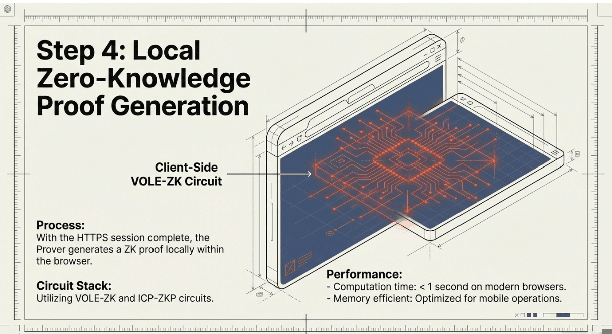 Con la sessione HTTPS completata e il traffico registrato, il Provante genera una prova a conoscenza zero sui dati localmente nel proprio browser. Utilizzando circuiti VOLE-ZK e ICP-ZKP, crea un impegno crittografico d = commit(m, r) dove m rappresenta il contenuto del messaggio (come "saldo = $7,200") e r è un'oscuramento casuale. La prova dimostra affermazioni specifiche, "saldo > $5,000" in questo esempio, senza rivelare il messaggio sottostante. Il sistema di prove VOLEitH consente a questo calcolo di avvenire in meno di un secondo sui browser moderni, con operazioni a basso consumo di memoria adatte per dispositivi mobili.