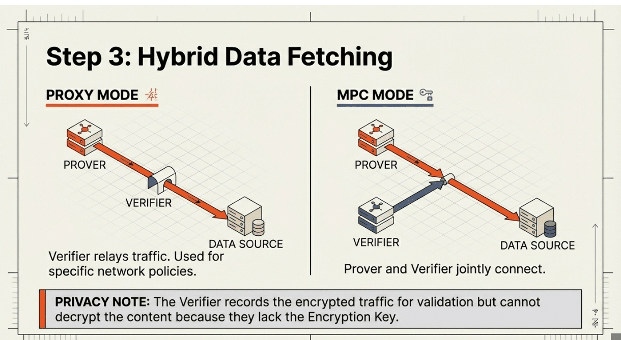 zkPass opera in Modalità Ibrida per gestire le limitazioni della rete del mondo reale. In Modalità Proxy, il Verificatore agisce come proxy di rete, registrando il traffico tra il Provante e la DataSource. In Modalità MPC, Provante e Verificatore agiscono congiuntamente come client della DataSource, dividendo la connessione TLS. Il protocollo cambia modalità automaticamente quando i server bloccano gli IP proxy o quando le configurazioni di rete richiedono approcci diversi. Questa adattabilità significa che zkPass funziona praticamente con qualsiasi endpoint HTTPS, dalle API bancarie alle piattaforme sociali fino ai siti di e-commerce.