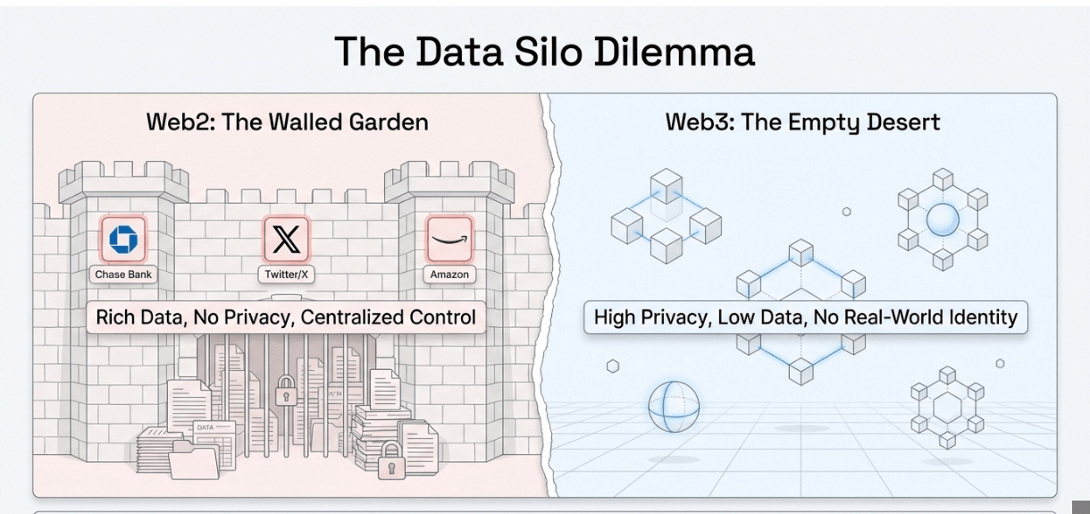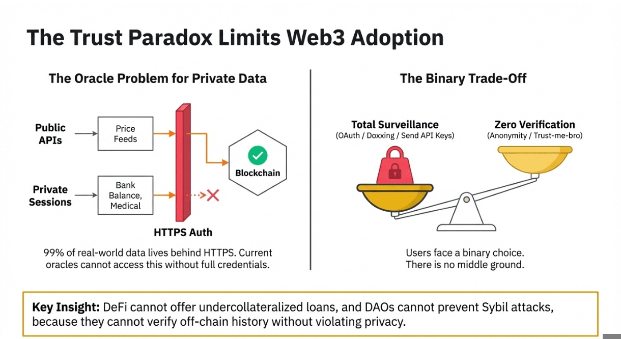 🔹 Il Paradosso della Fiducia nella Verifica dei Dati → Le applicazioni Web3 che necessitano di credenziali del mondo reale affrontano un'impossibile scelta: accettare dati auto-riportati (facilmente falsificabili) o integrare oracoli centralizzati che vedono tutto. I protocolli DeFi non possono verificare i punteggi di credito senza collaborare con broker di dati. Gli airdrop non possono confermare i follower di Twitter senza chiavi API. Ogni verifica introduce un nuovo intermediario fidato, ricreando la centralizzazione da cui Web3 doveva fuggire.