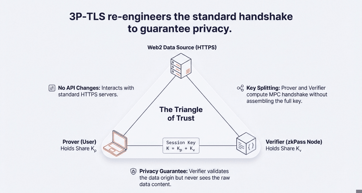 Il genio sta nei dettagli. Durante l'handshake 3P-TLS, il Provante (utente) si impegna alla propria chiave condivisa prima di apprendere la chiave di sessione completa, questo previene la falsificazione dei dati successiva. Il Verificatore rivela la propria chiave condivisa e registra tutto il traffico, ma poiché non ha la chiave di crittografia, non può leggerlo. La DataSource (il server HTTPS come la tua banca o LinkedIn) opera normalmente senza modifiche richieste. Una volta che la sessione termina, il Provante esegue un circuito di prova ZK sul traffico registrato, creando un impegno come d = commit(m, r) dove m è il messaggio e r è casualità. Il Verificatore valida questo impegno senza mai apprendere m.