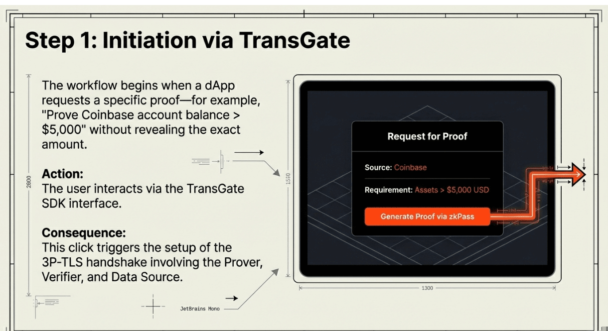 Un dApp richiede una prova specifica dall'utente, ad esempio, "prova che il tuo saldo dell'account Coinbase supera $5,000 senza rivelare l'importo esatto." L'utente passa attraverso l'interfaccia del SDK TransGate, che attiva l'handshake 3P-TLS tra tre parti: il browser dell'utente (Provante), il servizio di verifica del dApp (Verificatore), e il server della fonte di dati (DataSource, in questo caso l'endpoint API di Coinbase).