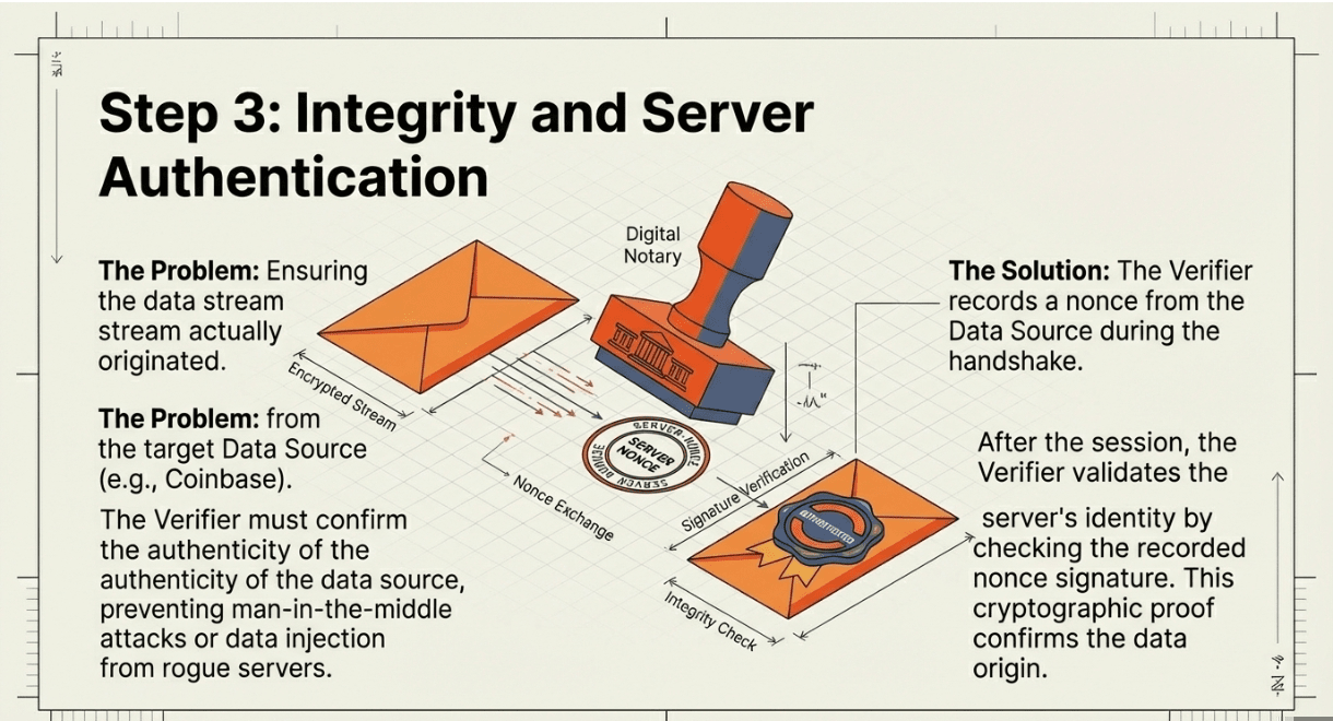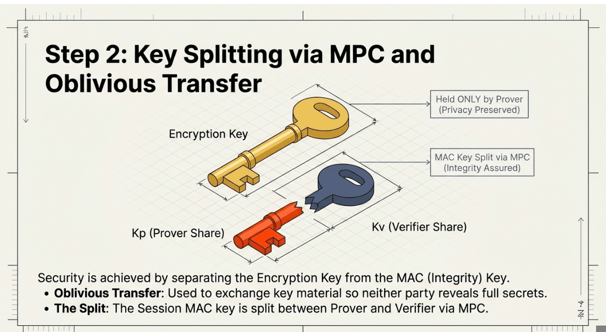 Il protocollo esegue un handshake TLS esteso utilizzando Diffie-Hellman a curva ellittica. Il Provante genera la propria chiave condivisa K_p e si impegna ad essa in modo crittografico prima di apprendere la chiave di sessione completa, questo impegno previene la falsificazione dei dati successiva. Il Verificatore genera simultaneamente la propria chiave condivisa K_v e registra un nonce dalla DataSource per l'autenticazione del server. Entrambe le parti utilizzano il trasferimento obliquo per scambiare materiale chiave senza rivelare segreti completi. Criticamente, la chiave MAC di sessione (per il controllo dell'integrità) è divisa tra Provante e Verificatore tramite MPC, ma solo il Provante riceve la chiave di crittografia.