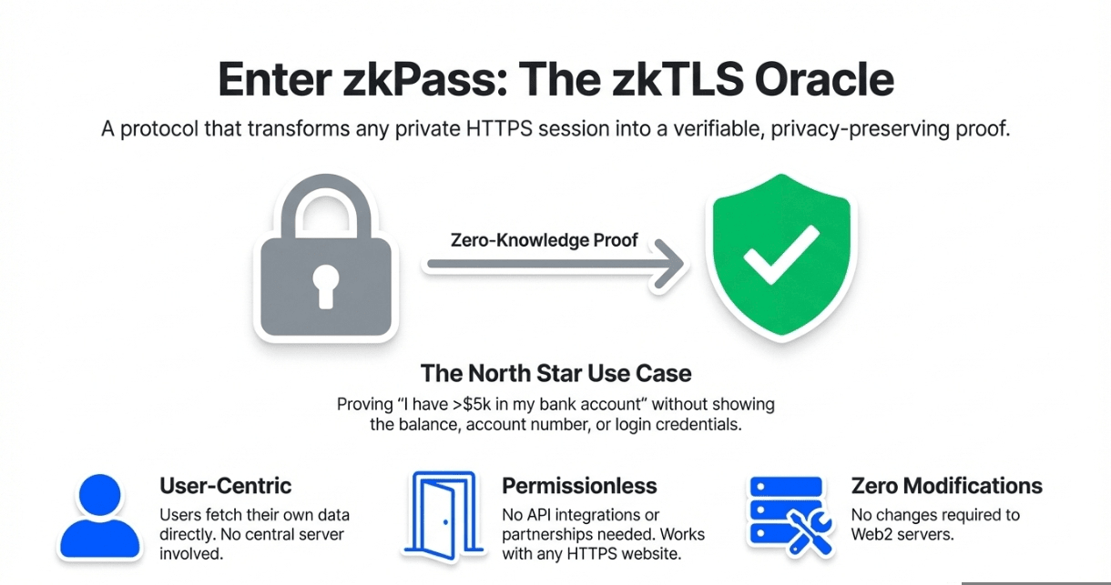 zkPass risolve questo con un protocollo oracle zkTLS. Trasforma qualsiasi sessione HTTPS, il tuo accesso al bancomat, il tuo profilo LinkedIn, la cronologia dei tuoi viaggi con Uber, in una prova crittografica verificabile che vive sulla blockchain. Dimostri affermazioni sui tuoi dati privati ("Ho un punteggio di credito superiore a 750" o "Ho completato 500 viaggi") senza rivelare le informazioni sottostanti a nessuno. Nessuna integrazione API richiesta. Nessuna modifica del server necessaria. Basta matematica.