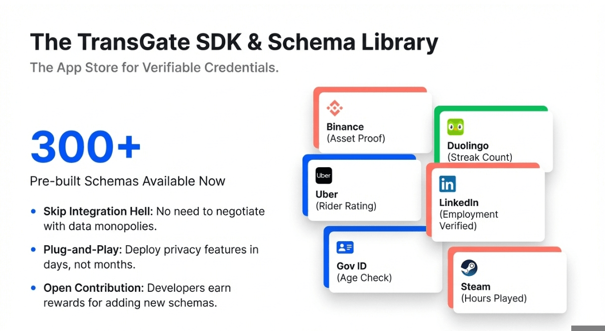 Il Programma di Accelerazione delle Applicazioni Verificabili (VAAP) ha allocato $5,5 milioni per supportare lo sviluppo dell'ecosistema, finanziando oltre 1 milione di utenti attestati attraverso integrazioni con piattaforme come Binance, Coinbase, Duolingo, Uber e LinkedIn. Gli sviluppatori guadagnano ricompense per contribuire a nuovi schemi, espandendo la copertura del protocollo senza colli di bottiglia centrali. Il SDK TransGate riduce il tempo di integrazione da mesi (negoziazioni API tradizionali) a giorni (distribuzione degli schemi), accelerando il time-to-market per le applicazioni focalizzate sulla privacy.