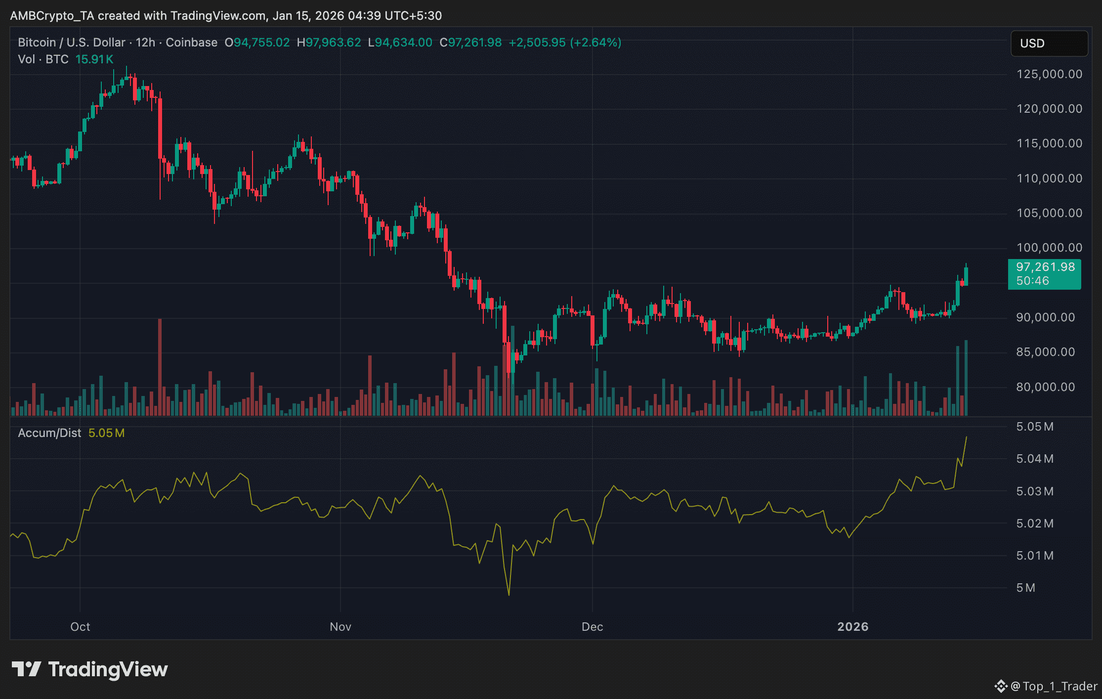 At the time of writing, Bitcoin was trading around $97,200, according to TradingView data. This marks a decisive break above the upper boundary of a multi-week consolidation range that had capped price action since late 2025.