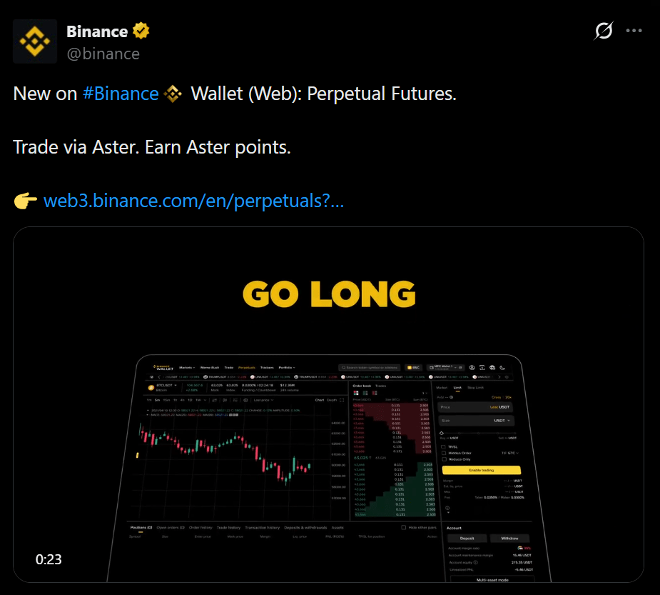 Con $ASTER integrato, gli utenti possono ora negoziare futures perpetui direttamente all'interno di Binance Wallet mantenendo la piena autogestione. Nessuna chiave consegnata, nessun rischio legato a un conto centralizzato, ma accesso a derivati avanzati.