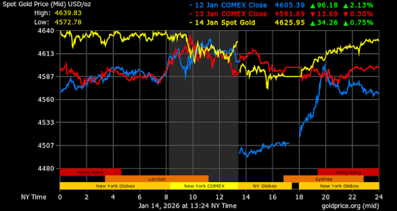 Al 15 gennaio 2026, lo XAU/USD a vista si sta scambiando intorno a 4.585-4.600 dollari dopo un leggero calo rispetto al massimo storico di ieri di ~4.643 dollari. Sono già +6-7% dall'inizio dell'anno, dopo un rialzo fenomenale del ~65-69% nel 2025. Siamo in piena fase di scoperta del prezzo – e i fattori scatenanti si accumulano rapidamente!