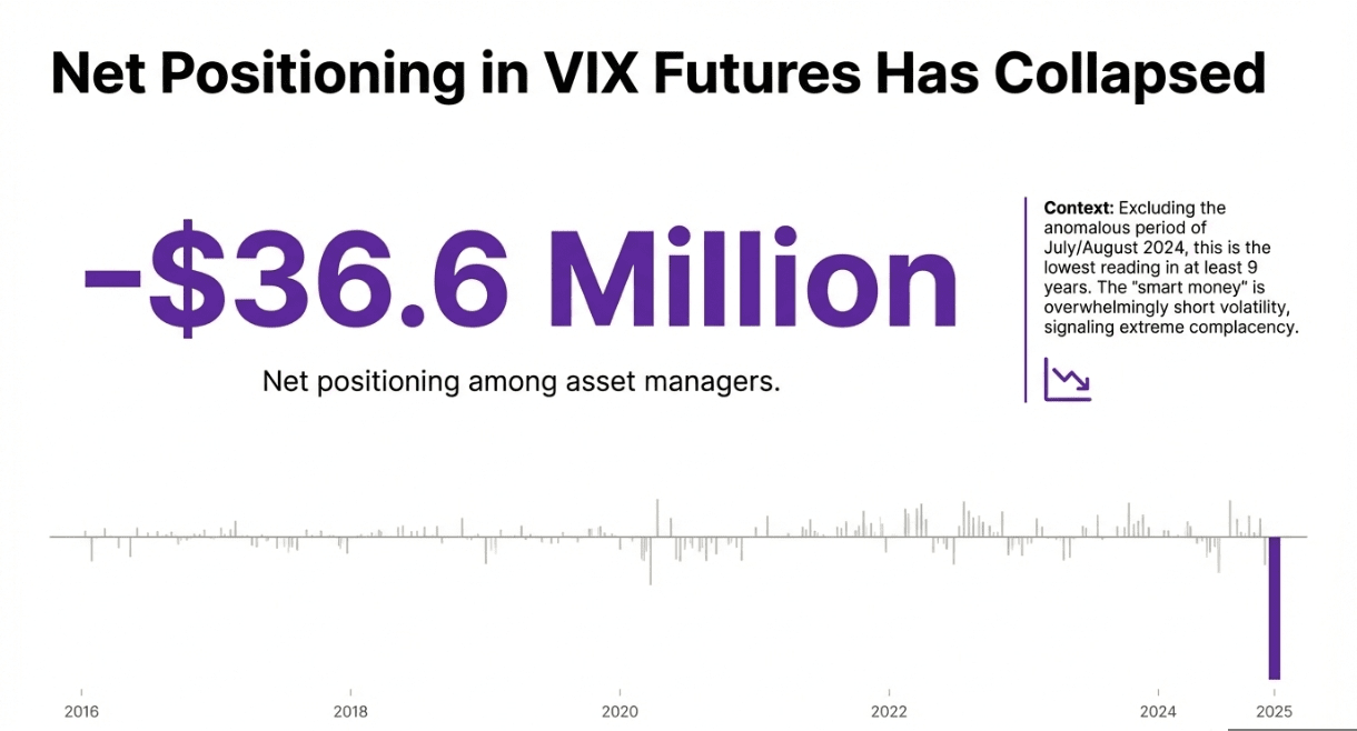 Minimo storico da 9 anni: la posizione netta sui future del VIX tra i gestori di portafogli è scesa a -36,6 milioni di dollari. Escludendo il periodo anomalo di luglio e agosto 2024, si tratta del valore più basso negli ultimi almeno 9 anni.