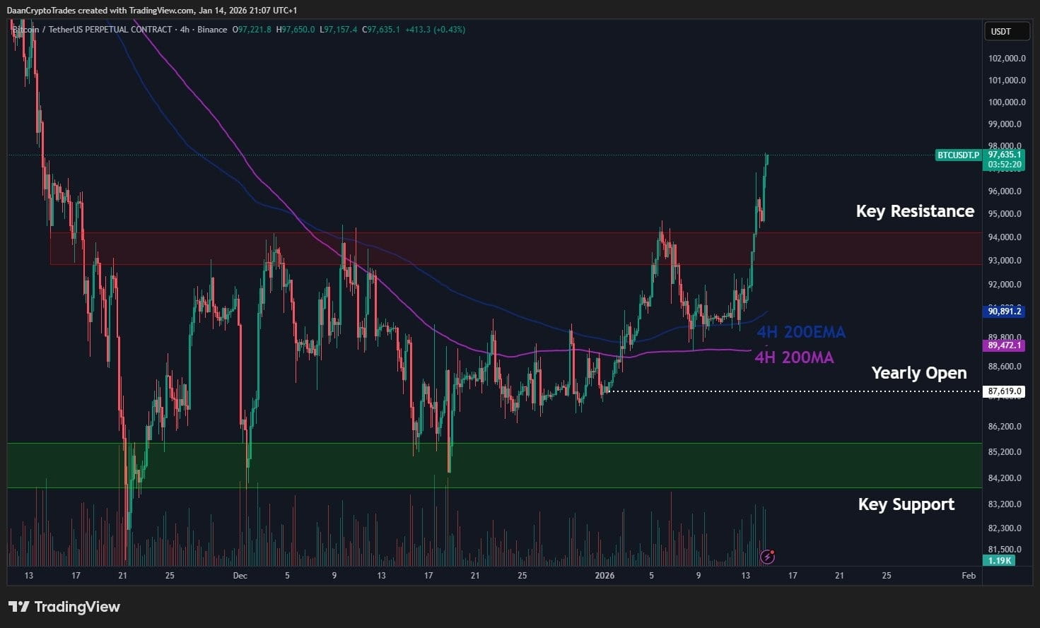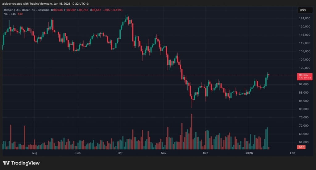 1. Svolta tecnica: Dopo un lungo movimento laterale nella fascia $94.000 - $96.000, il bitcoin è riuscito a superare questo livello, raggiungendo i $97.939 su Bitstamp il 13 gennaio. Gli analisti ritengono che la rottura sarà confermata se il prezzo manterrà i $94.000 come nuovo supporto.