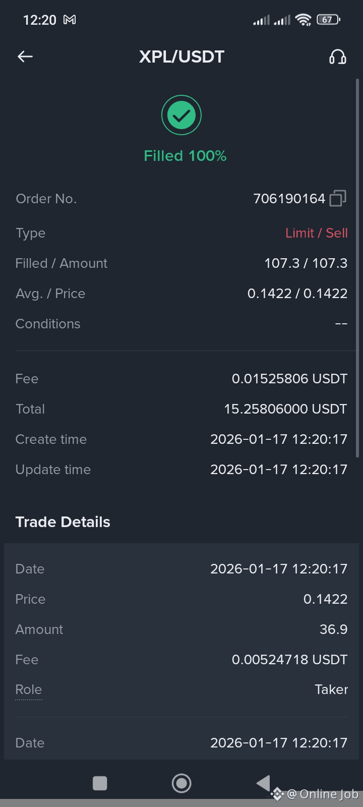 In my latest trade, I placed a Limit Sell order for 107.3 XPL, which was 100% filled at an average price of 0.1422 USDT. The total value of the trade was 15.25806 USDT, with a trading fee of 0.01525806 USDT. The order was executed smoothly without delay, and part of the trade was filled as a taker, showing healthy market activity and order matching.