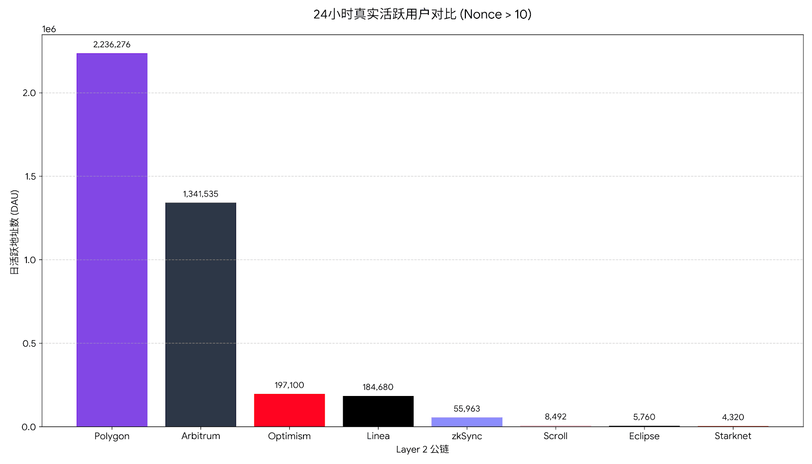 In secondo luogo, è stata impostata in modo uniforme una soglia di "Nonce > 10" per tutte le catene pubbliche basate su EVM (incluse Arb, Base, Scroll, zkSync, Starknet, ecc.). Ciò significa che i nuovi account "usa e getta" con pochissime interazioni vengono esclusi dalle statistiche degli "utenti principali a lungo termine".