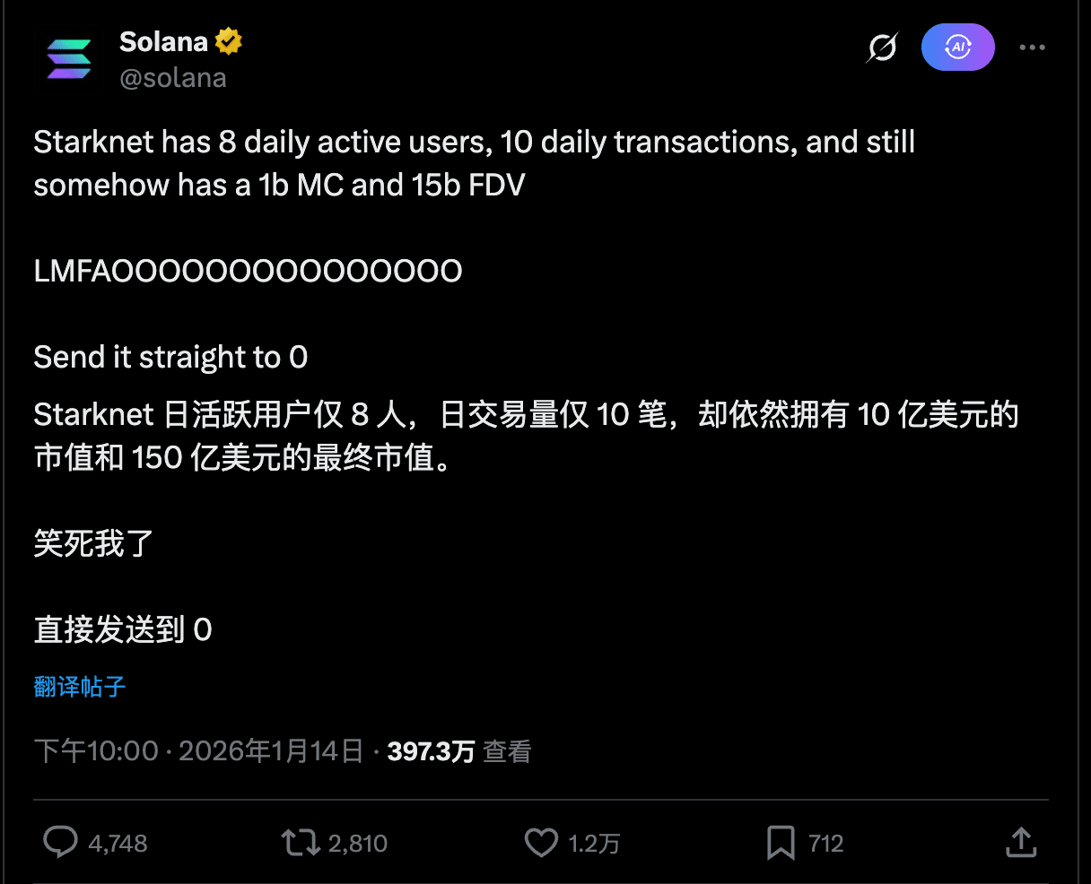 Il 14 gennaio, il tweet ufficiale di Solana ha preso di mira Starknet, pubblicando i dati sugli utenti attivi al giorno che mostrano solo una cifra a una cifra, ridendo e dicendo "muoio dal ridere, andiamo a zero"