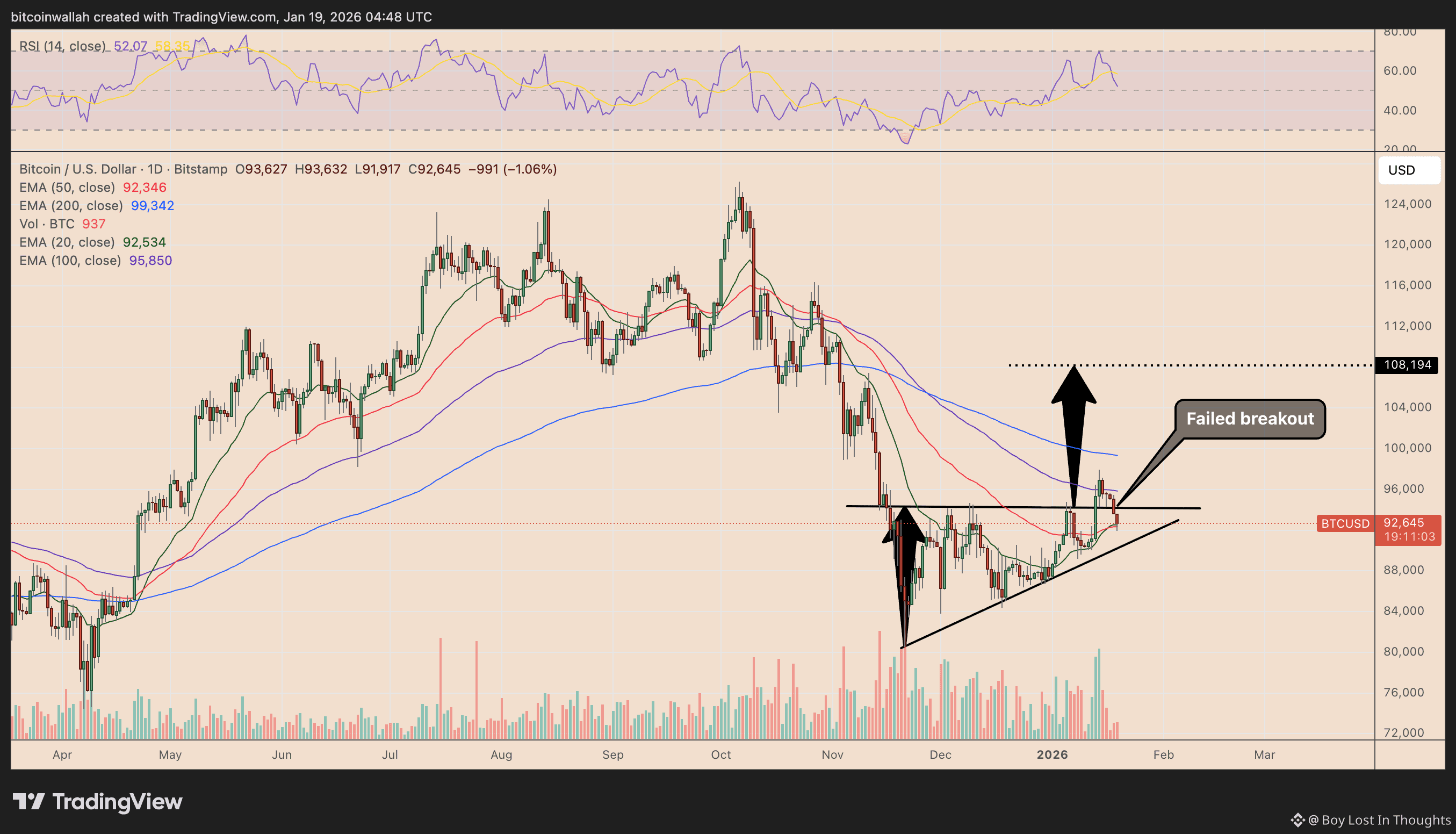BTC broke below $91,920, invalidating an ascending triangle setup that had projected a move above $100,000.