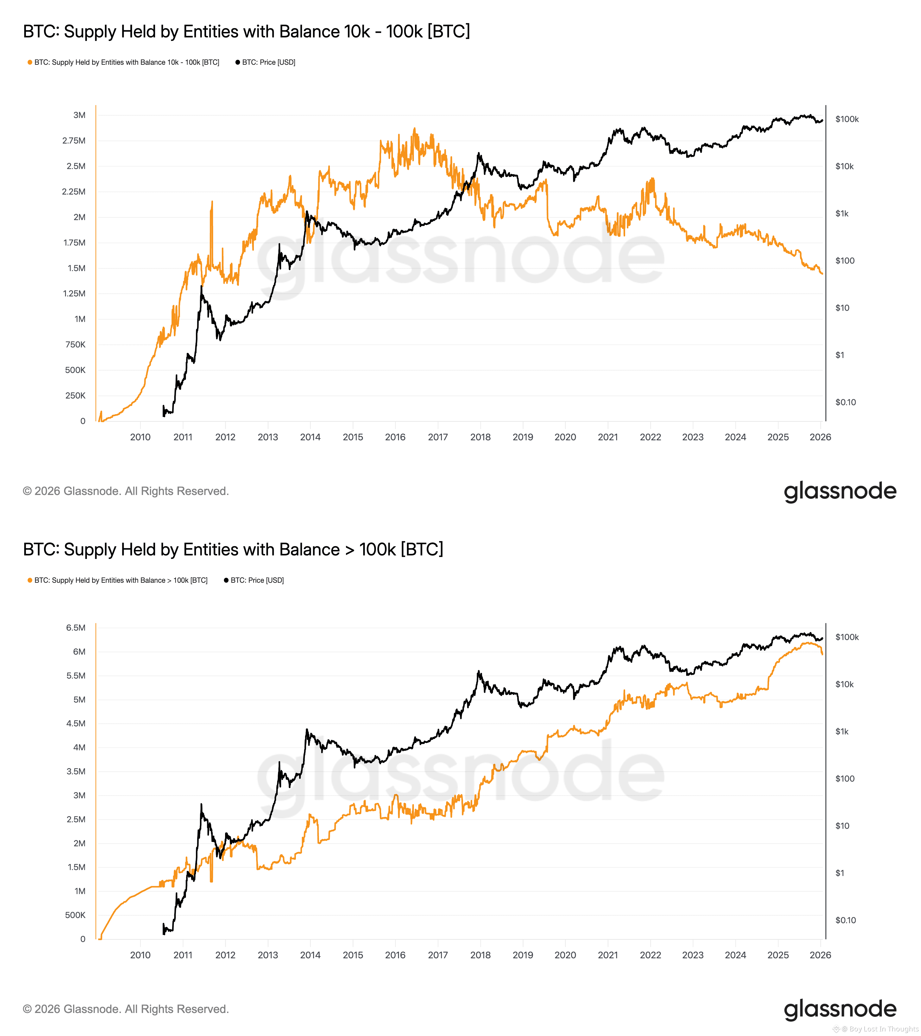 Large holders (10,000+ BTC) are reducing their balances, signaling distribution, while mid-tier holders (1,000–10,000 BTC) are buying the dip.