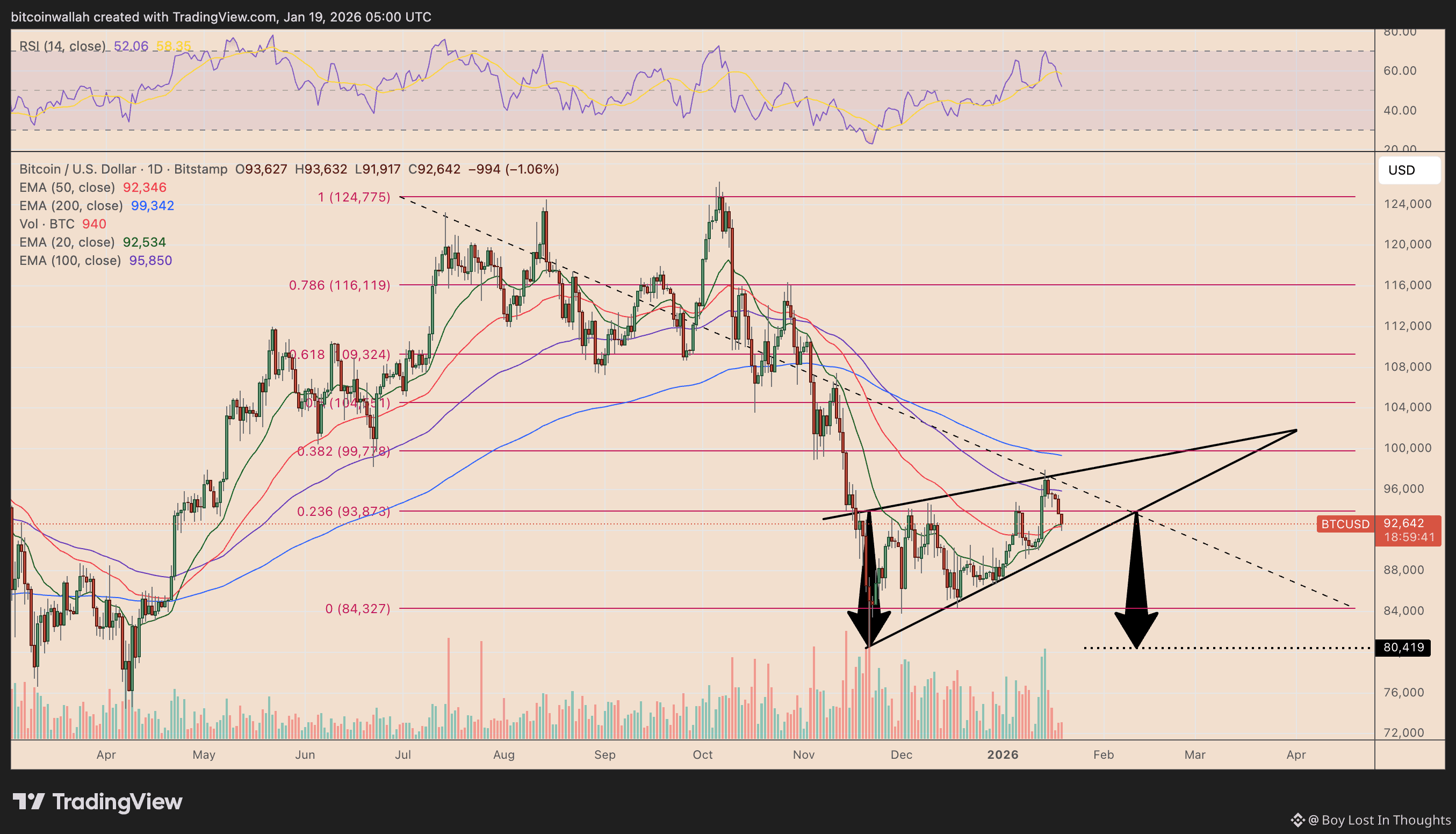 A rising wedge pattern on the daily chart suggests weakening momentum and raises the risk of a drop toward $84,000–$80,000 if support fails.