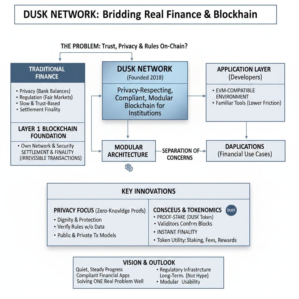 Dusk sits right in the middle of this reality, trying to create blockchain infrastructure that institutions can actually trust. I’m often struck by how calm this vision feels compared to the noise of crypto, because it accepts that finance moves slowly and that trust is earned, not demanded.