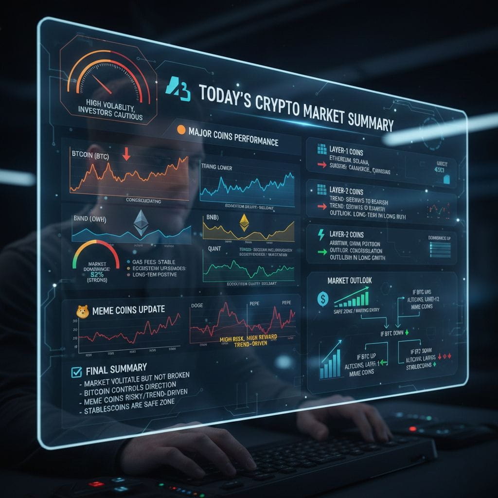 The crypto market is showing high volatility with a slightly bearish to sideways trend. Major coins faced selling pressure, while some altcoins remained relatively stable. Investors are cautious due to profit-taking and short-term uncertainty, but the long-term outlook remains constructive.
