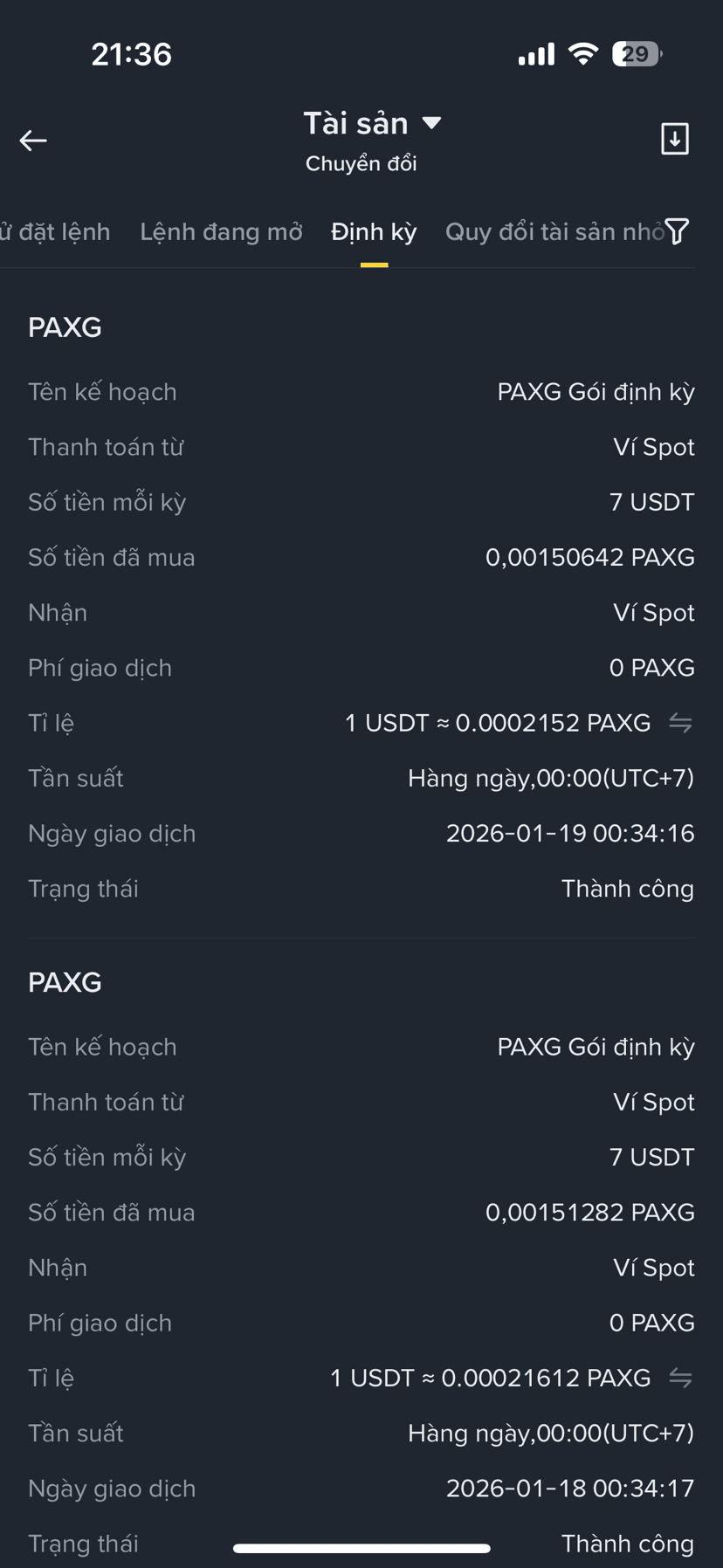 Questo mese ho deciso di non comprare oro né di vendere oro fisico, ma di passare completamente all'acquisto $PAXG sul mercato con la funzionalità di conversione periodica, non devo dedicare molto tempo all'acquisto di oro come prima. Ogni giorno dedico 7$ per acquistare oro da accumulare a lungo termine. Ogni giorno, esattamente all'ora, Paxg si aggiungerà automaticamente al mio conto Spot.