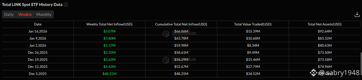وفقًا لبيانات sosovalue، عزز التعرض المؤسسي عبر صندوق Chainlink المتداول (ETF) أيضًا المشاعر الصعودية. ظلت التدفقات الداخلة الأسبوعية إيجابية باستمرار، مما رفع إجمالي الأصول الصافية إلى ما يقرب من 92.6 مليون دولار، أي ما يقرب من 1٪ من القيمة السوقية لـ LINK. تتناقض هذه التراكمات الثابتة مع تردد السوق الأوسع.