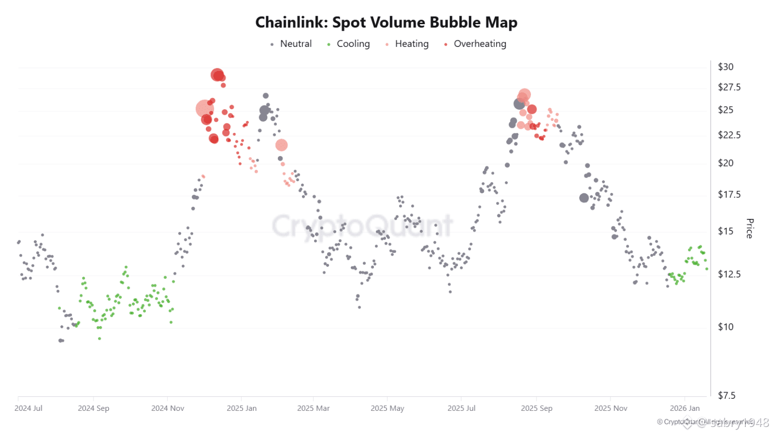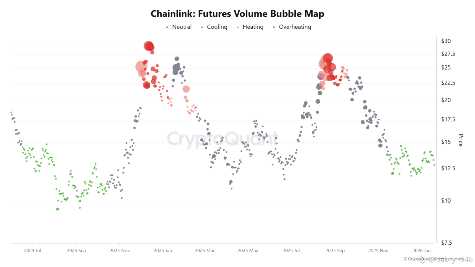 في الوقت نفسه، توفر ديناميكيات الحجم سياقًا إضافيًا. تشير خريطة فقاعة الحجم (Volume Bubble Map) لـ LINK إلى أن كلاً من الأسواق الفورية والآجلة دخلت مرحلة تبريد. تاريخيًا، سبقت مثل هذه الظروف تحركات اتجاهية قوية، خاصة عندما تصاحبها مشتريات عدوانية من "الآخذ" (taker).