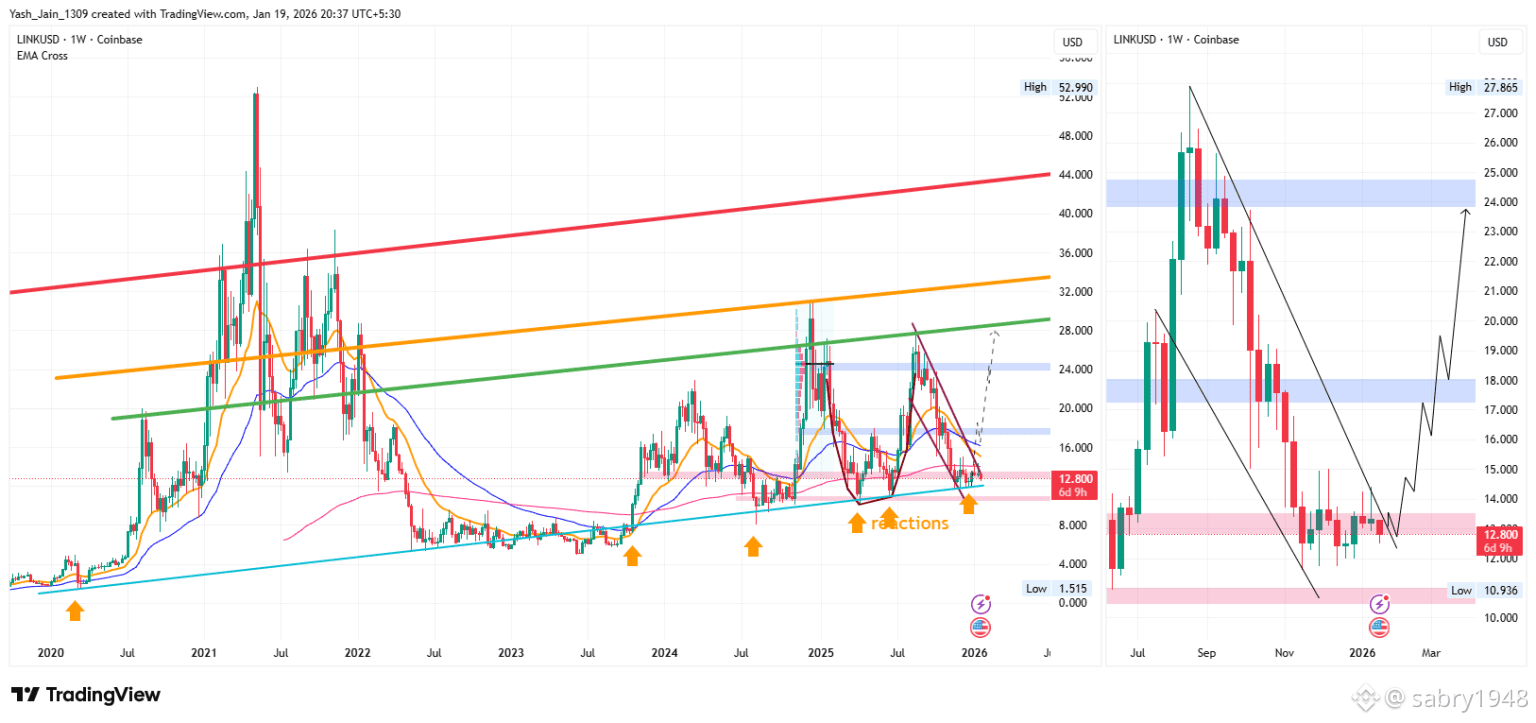 من منظور فني، يستمر سعر LINK في التضاغط على طول خط اتجاه صاعد متعدد السنوات سبق تاريخيًا موجات صعود قوية. وفي الوقت نفسه، يشبه الهيكل الأوسع تكوين "الكوب والمقبض" (cup-and-handle) طويل الأجل، مع تداول السعر بالقرب من الحد العلوي للمقبض. بمجرد كسره، يمكن أن يكون الارتفاع إلى 28.69 دولارًا هو الهدف التالي، مما يمثل ارتفاعًا بأكثر من 120٪.