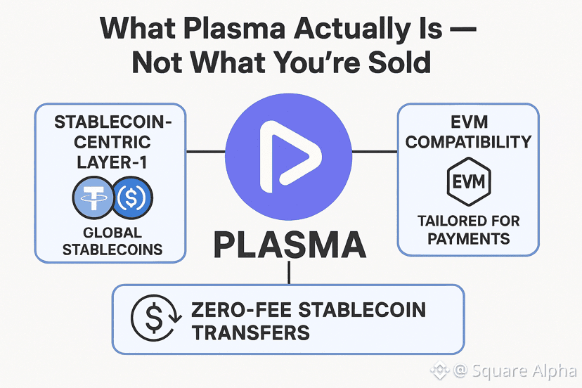 Plasma isn’t another memecoin or a copy‑paste EVM chain. It’s a stablecoin‑centric Layer‑1 network built for fast, cheap, and real-world compatible payments — particularly global stablecoins like USDT and USDC. Plasma supports zero‑fee stablecoin transfers, EVM compatibility, and features tailored toward payments and financial primitives rather than generic yield farming environments.