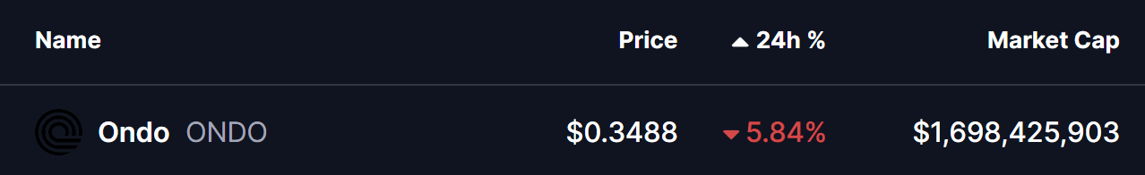 Il token di asset del mondo reale (RWA) Ondo (ONDO) sta negoziando sotto pressione vicino a $0,35, estendendo la sua tendenza al ribasso a breve termine in mezzo a un più ampio sell-off del mercato delle criptovalute. L'ultima ondata di debolezza segue l'escalation delle tensioni commerciali tra Stati Uniti e UE, che ha scatenato oltre $851 milioni in liquidazioni lunghe, trascinando giù asset principali come Bitcoin (BTC) ed Ethereum (ETH) di circa il 2,5% e il 4,5%, rispettivamente, nelle ultime 24 ore.