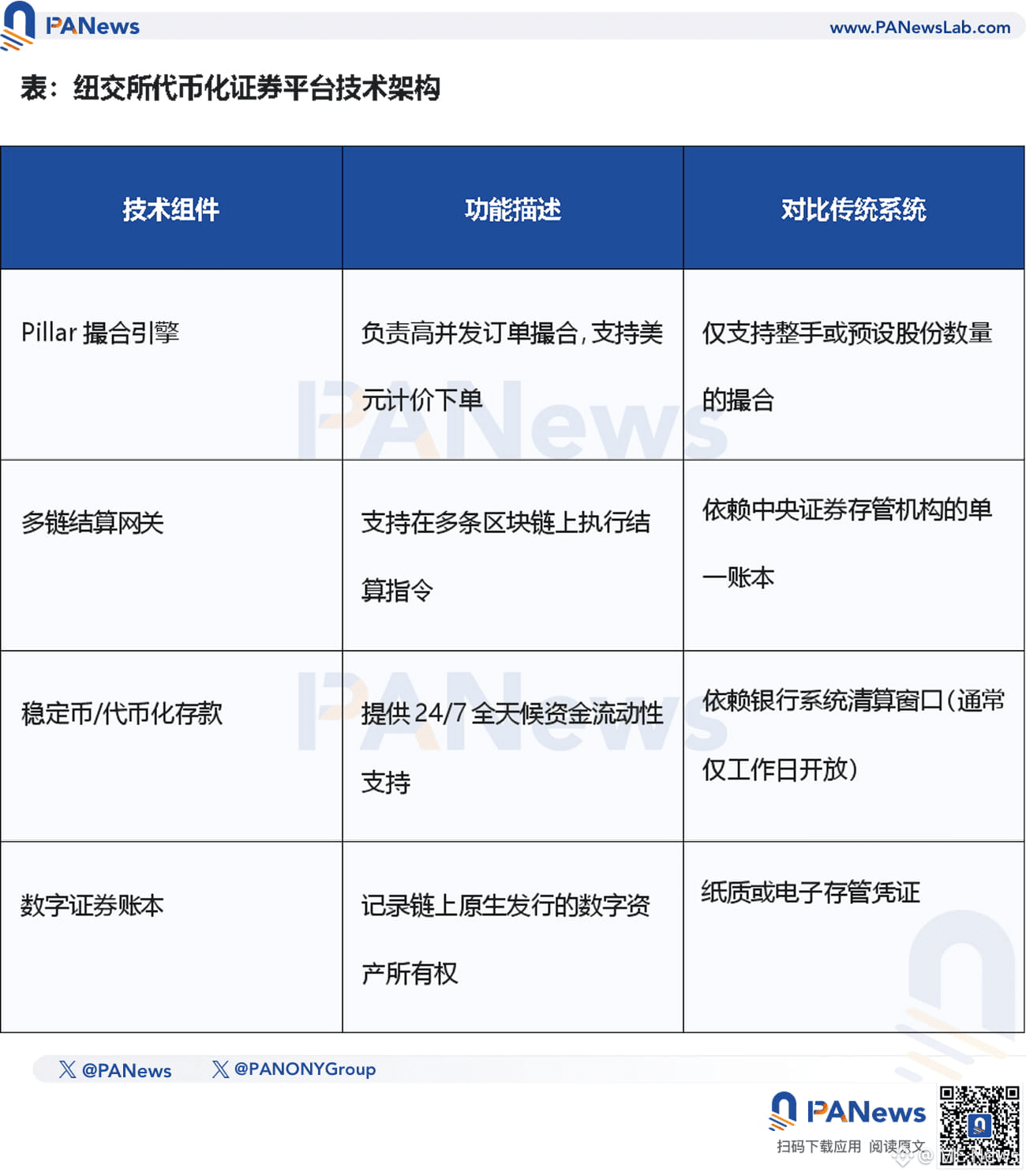 纽交所计划推出的代币化证券平台在技术路线上采取了一种“高性能匹配+链上最终性”的混合架构。这一设计的核心在于利用已有的Pillar匹配引擎处理高频订单撮合,来保证交易的公平性和速度,而将清结算环节迁移至区块链上,从而实现24/7交易。