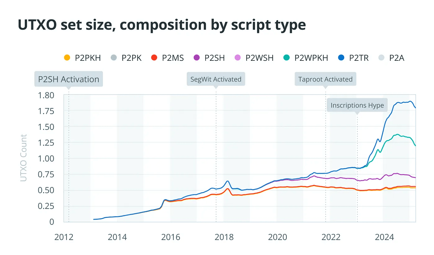 P2TR è comune per numero, circa il 32,5% degli UTXO, ma piccolo per valore nello stesso istante, circa lo 0,74% o 146.715 BTC. La sua esposizione è legata al design della chiave-path di Taproot, dove una chiave pubblica modificata è visibile on-chain.